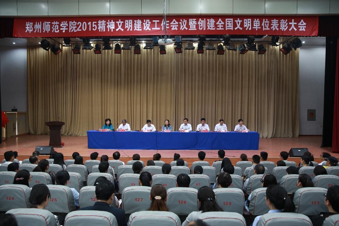 为表彰先进,树立典型,鼓舞和激励广大师生勤奋学习、扎实工作,4月28日下午郑州师范学院2015年精神文明建设工作会议暨创建全国文明单位表彰大会在老校区七号楼报告厅举行。我校全体副科级以上干部、文明督导员、受表彰先进个人、先进班集体代表、志愿者代表等500多人参加大会,大会由党委副书记、工会主席主持。