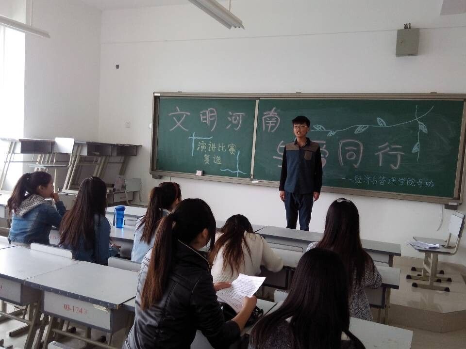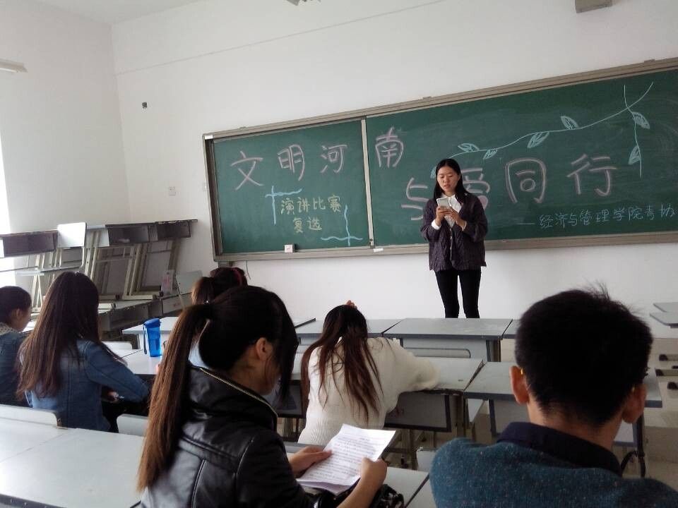 2014年10月12日上午10点,经济与管理学院青年志愿者分会在经管楼C415举办以“文明河南、与爱同行”为主题的演讲选拔赛。