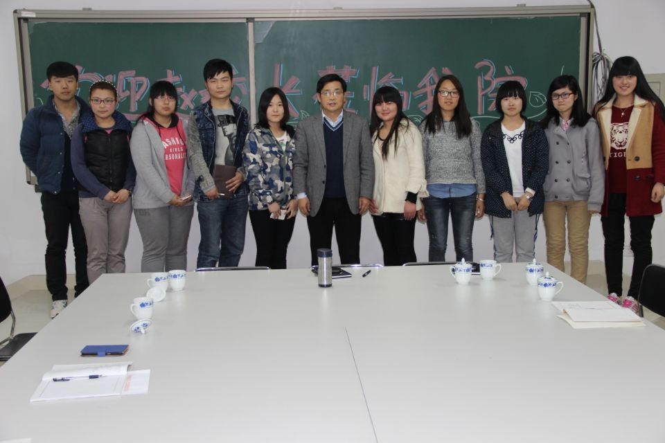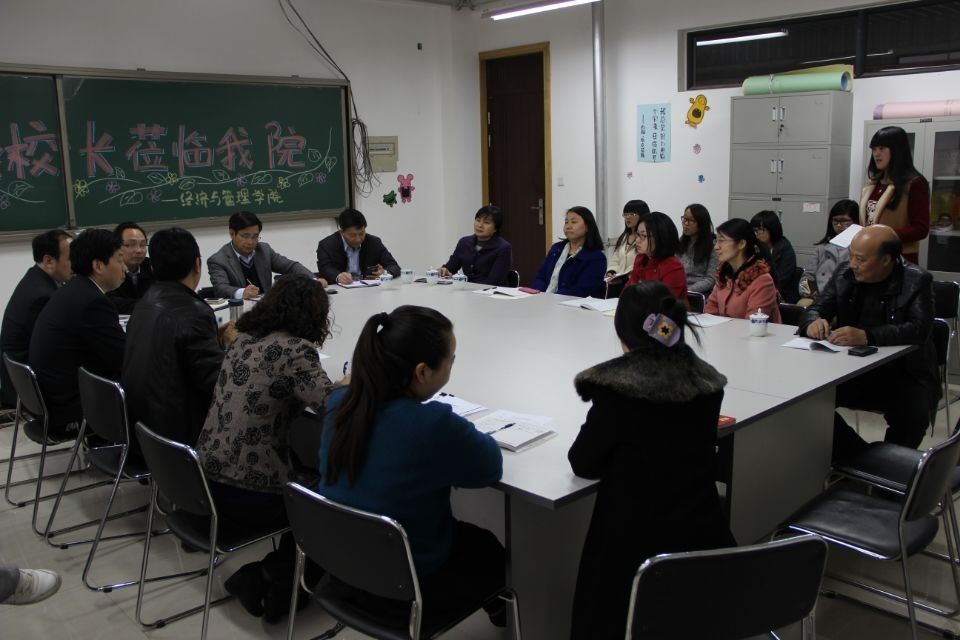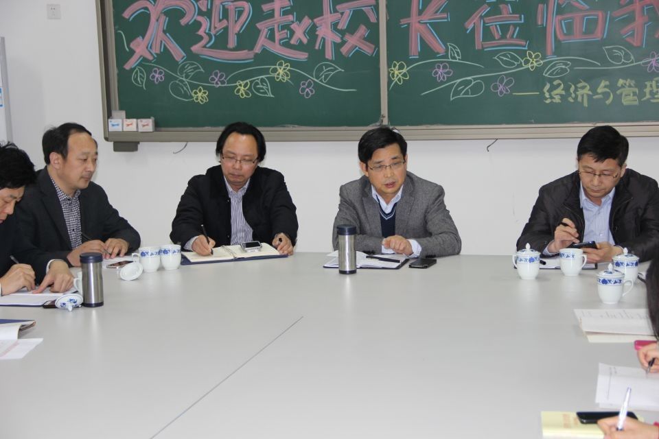 2014年3月19日下午,赵健校长到经济与管理学院参加群众路线实践教育活动座谈会,会议由经管院党总支副书记杨保河主持,党政办公室主任王治浩、副主任王志军、教务处长盛宾、人事处长范会玲、科研处长王永恒、经管院全体教师及学生代表参加。