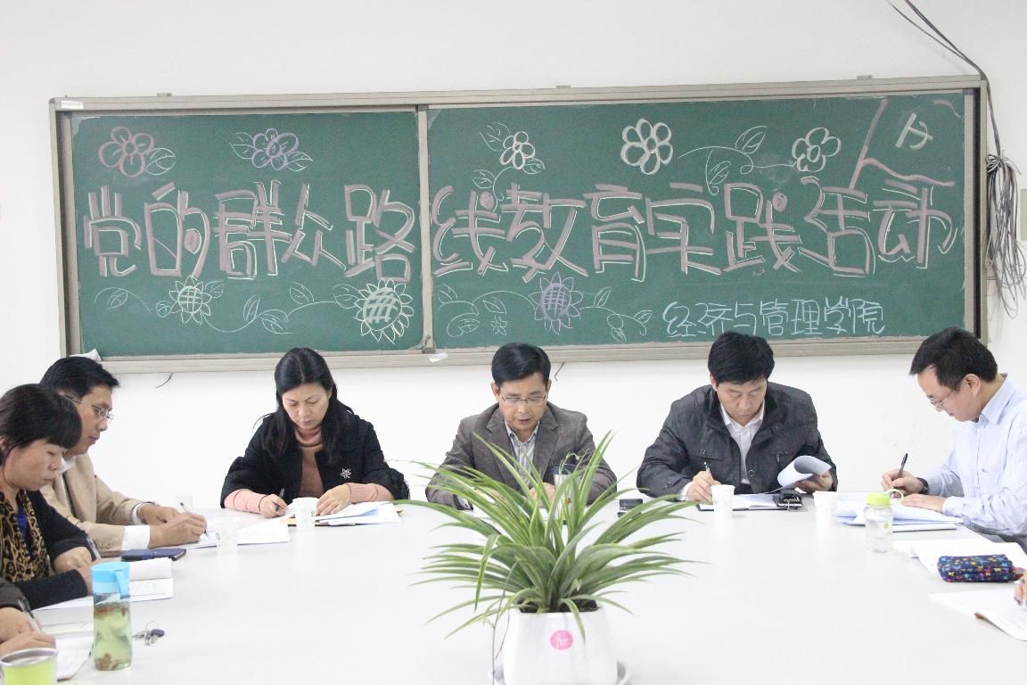 首先,经济与管理学院党总支副书记杨保河作《经济与管理学院党的群众路线教育实践活动工作总结》报告。杨书记主要从教育实践活动的基本情况和主要做法、取得的主要成果、主要启示、存在的主要问题及意见建议五个方面对经济与管理学院党的群众路线教育实践活动进行了总结。然后,赵健校长对经济与管理学院党的群众路线教育实践活动工作进行讲评,赵校长完全赞同《经济与管理学院党的群众路线教育实践活动工作总结》,认为总结是客观、全面的,对经济与管理学院党的群众路线教育实践活动开展情况给予充分肯定,并结合经济与管理学院的实际情况,提出了三点建议:一是思想上要重视,要充分认识党的群众路线教育实践活动群众评判工作的重要性和必要性;二是落实整改情况,明确重点,转变作风,在困难中求发展;三是要客观、公正、实事求是地评判,规范地填写表格。