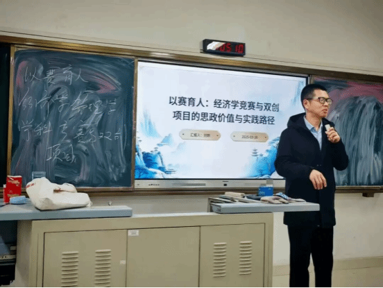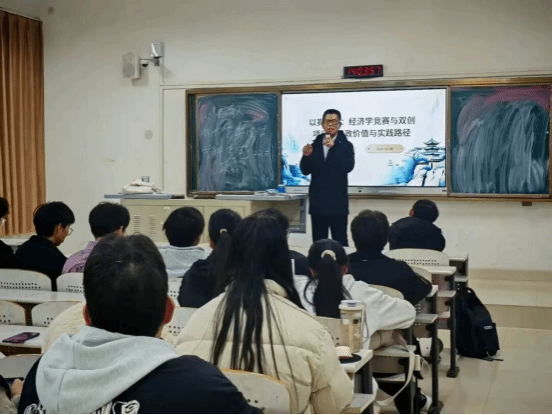 在讲座过程中,刘昕老师对参赛作品类别、申报要求等进行了深入讲解。参赛作品主要分为自然科学类学术论文、哲学社会科学类社会调查报告和科技发明制作类三类。让同学们了解竞赛分类与最新动态。此外,刘老师还特别强调,"挑战杯"作为国家级双创赛事,既是专业能力的竞技场,更是思政教育的实践场。他以"三全育人"综合改革为切入点,提出将社会主义核心价值观融入赛事全流程;针对哲学社会科学类作品,特别设置"中国之治"专项赛道,鼓励学生运用经济学理论解读中国发展奇迹。