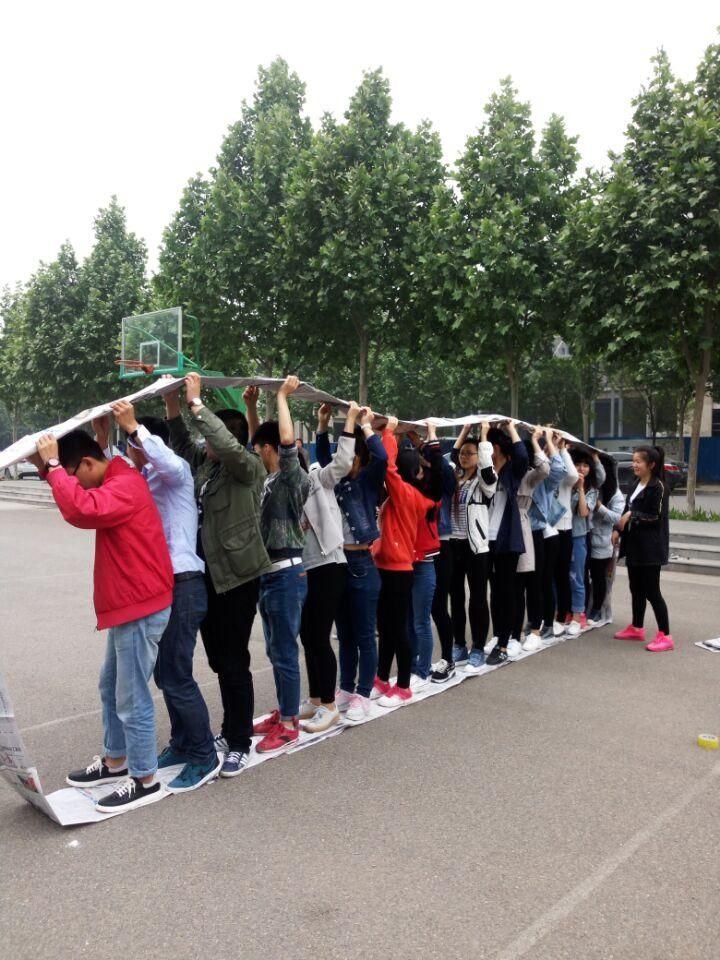 首先将所有干事分为三个团队,每个团队推选出各自的队长,由队长组织自己团队制定队名,口号。 接着各队抽签决定先后顺序,分别进行无敌风火轮、齐眉棍和终极目标三个游戏。同学们积极参与到活动中,大家不仅玩的开心,而且增进了同学之间的了解与交流!特别是游戏无敌风火轮,利用报纸和胶带制作一个可以容纳小组成员的封闭式大圆环,将圆环立起来,成员站到圆环内边走边滚动大圆环,向前走25米。这个游戏考验队长的组织分工的思想和能力,同时需要队员的团队协作配合精神。活动最后,大家交流心得体会,拍照留念!
