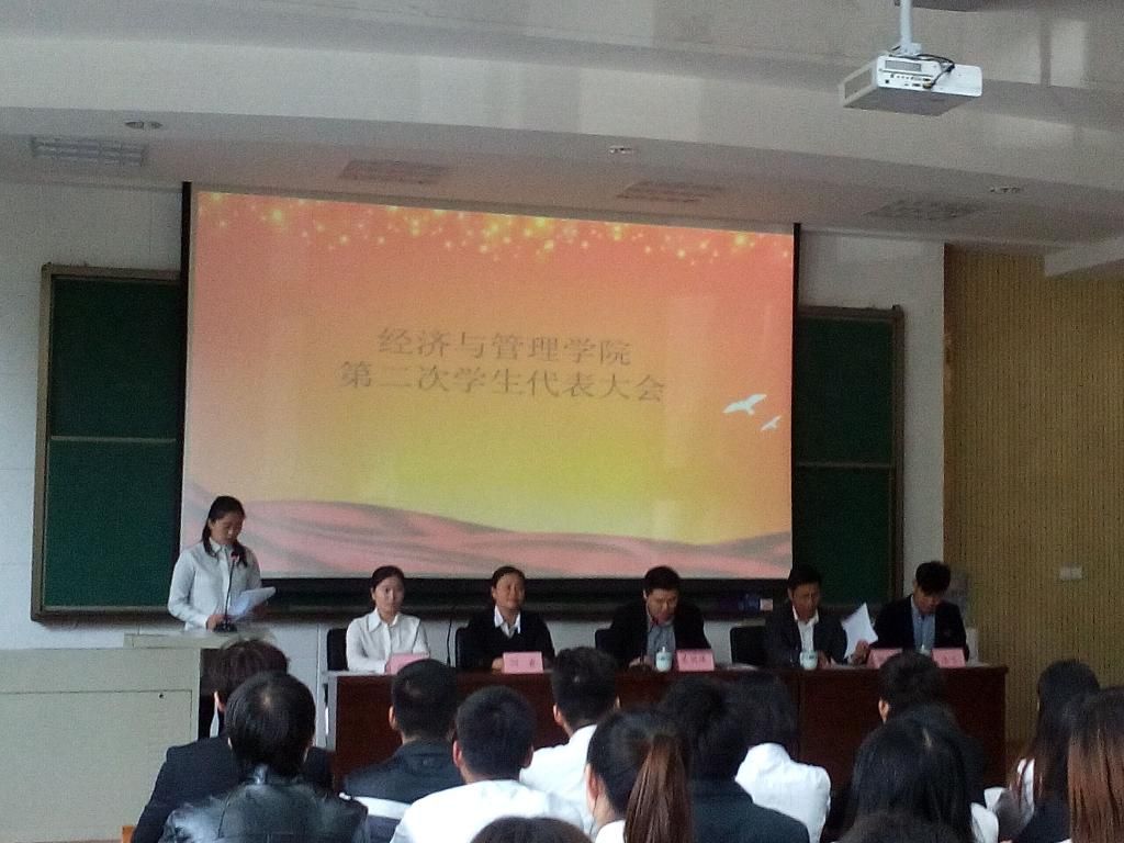 2015年10月29日,经济与管理学院第二次学生代表大会在经管楼一楼会议室隆重举行,全院126名学生代表参加了会议,校团委社团部部长吴国保老师、经管学院党总支副书记杨保河教授、经管学院闫睿老师以及校学生联合会主席潘飞同学都莅临本次大会。