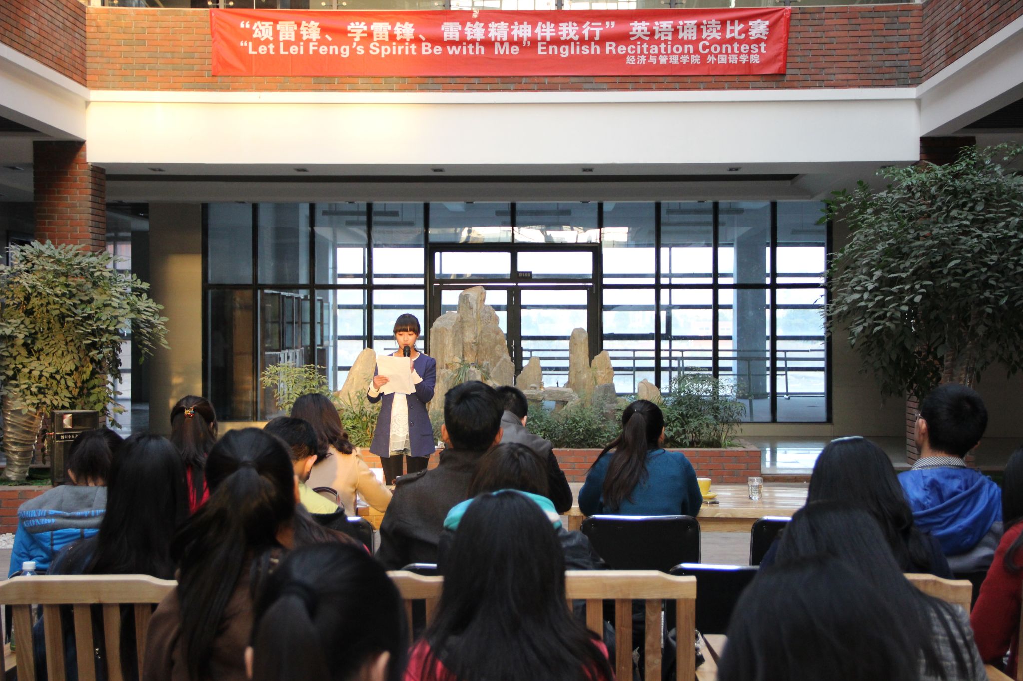 2014年3月20日星期四17:30在我校经管楼一楼,由经济与管理学院和外国语学院联合举办的“颂雷锋、学雷锋、雷锋精神伴我行”英语诵读大赛正式开赛。团委社团部部长吴国保、经济与管理学院团总支副书记刘晓宇、外国语学院团总支副书记高静、外国语学院赵海峰老师、白帆老师担任本次比赛评委。