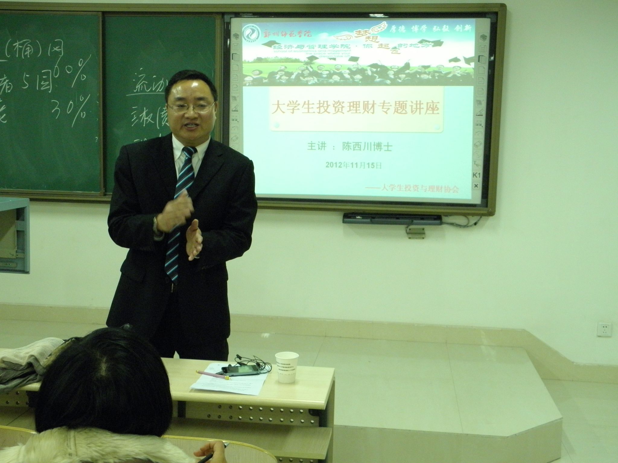 为增强大学生投资理财意识,普及其投资理财知识,提高其投资理财能力。11月15日下午四点,由郑州师范学院大学生投资与理财协会主办的“大学生投资理财专题讲座”在新校区A319教室举行。此次讲座由经济与管理学院副院长陈西川博士主讲,郑州师范学院大学生投资与理财协会指导老师刘晓宇老师主持,参加此次讲座的还有经济与管理学院辅导员张濯清老师及该协会全体会员。