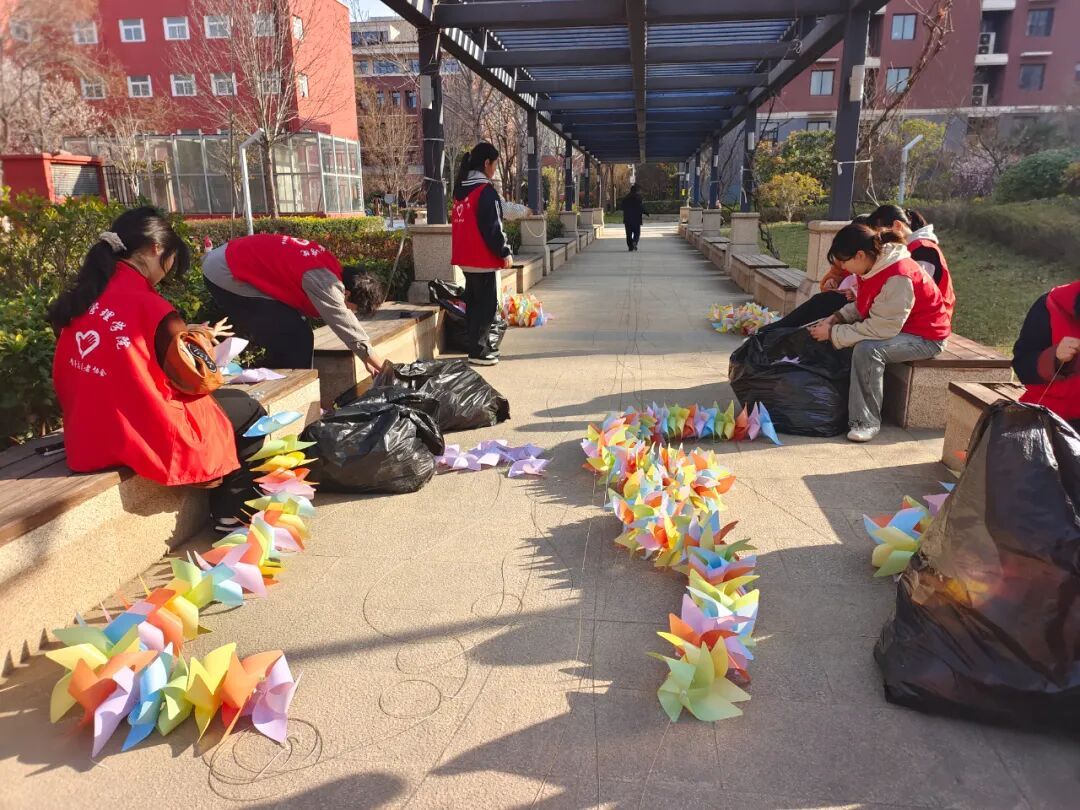 活动当天,志愿者早早来到活动现场,大家分工明确,迅速将制作风车的材料摆放整齐,并在园区负责人的指导下开始制作。开始制作后,志愿者们在制作的过程中慢慢找到制作技巧,一个个精巧细致的风车被呈现出来。没过多久,活动室的桌子上便堆满了色彩斑斓的风车。志愿者们收集好装饰园区所需要的风车后,来到了园区走廊,配合园区师傅悬挂风车。园区的负责老师将任务要求传达给志愿者之后,工作开始有条不紊地进行,活动整体进展顺利。很快,走廊变得五彩斑斓,微风拂过,风车轻响,每一声都仿佛在称赞志愿者们无私奉献的精神。
