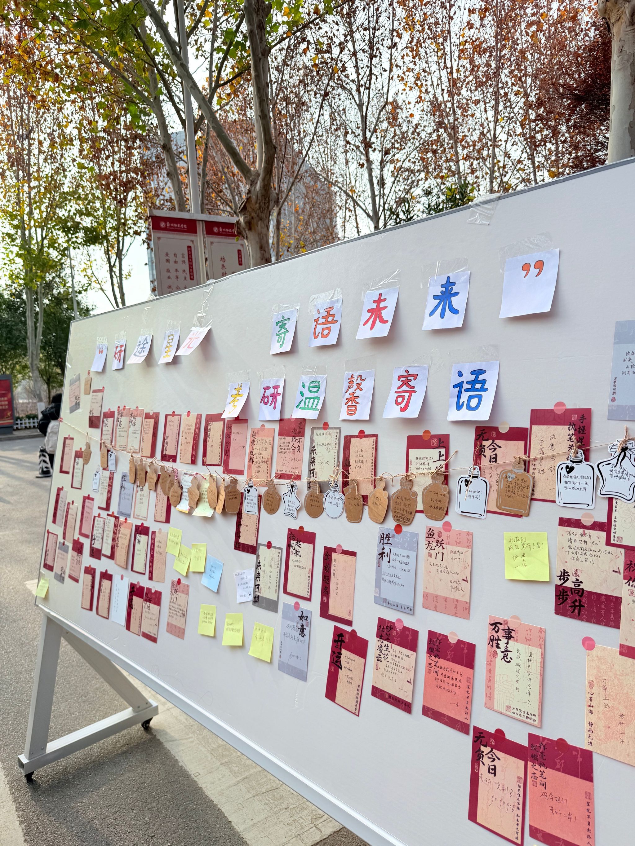 本次活动面向全校学生开展,得到各学院学生的积极响应与广泛参与。活动设置实体寄语展示板,以饱含情感的文字为载体,参与学生在便签上书写祝福与鼓励话语,定向传递给考研学子,有效帮助考生缓解备考焦虑,进一步坚定其逐梦信念与备考目标。