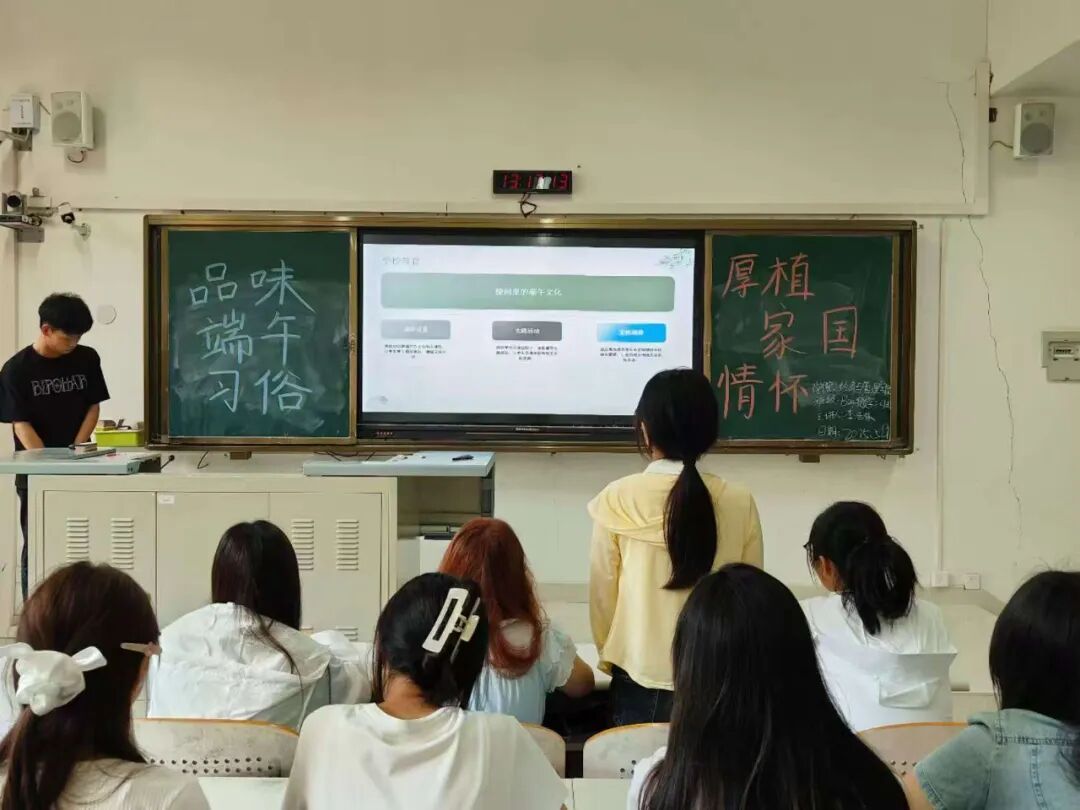 会议伊始,主讲人以端午起源传说为引,与参会学生一同探寻历史长河中那些动人故事。从屈原投江明志的赤诚,到伍子胥忠谏身死的悲壮,一个个鲜活的历史人物,使我院学子对端午起源有了更为立体而深刻的认知。随后,主讲人深入讲解赛龙舟、吃粽子等传统习俗,并带领学生梳理节日的历史脉络,从早期单一的祭祀仪式,到如今丰富多彩的民俗活动,端午文化的演变历程徐徐展开,让我院学生对节日的发展脉络有了清晰且深入的理解。主讲人进一步探讨传统节日的当代传承路径,从个人文化实践、社区活动参与、校园文化建设,到媒体传播创新,为青年大学生指明了弘扬端午文化的多元方向。