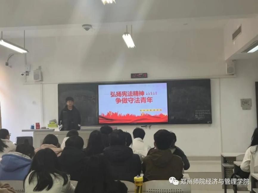 12月4日中午,经济与管理学院23级全体学生在文汇楼召开了以“弘扬宪法精神,争做守法青年”为主题的政治学习会议。本次会议主要分为四个部分,分别为“宪法日设立背景”“宪法日主题意义”“宪法日宣传教育”和“如何弘扬宪法精神”。