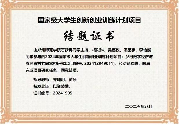 经济与管理学院2项高级别大学生创新创业项目顺利结项。我院2022级投资学专业石梦冉同学主持,杨以琳、吴嘉仪、廖星宇、李怡燃同学参与的2024年国家级大学生创新创业训练计划项目:乡村数字经济与农民农村共同富裕研究(项目编号:202412949011),经结题验收,圆满完成项目研究任务。