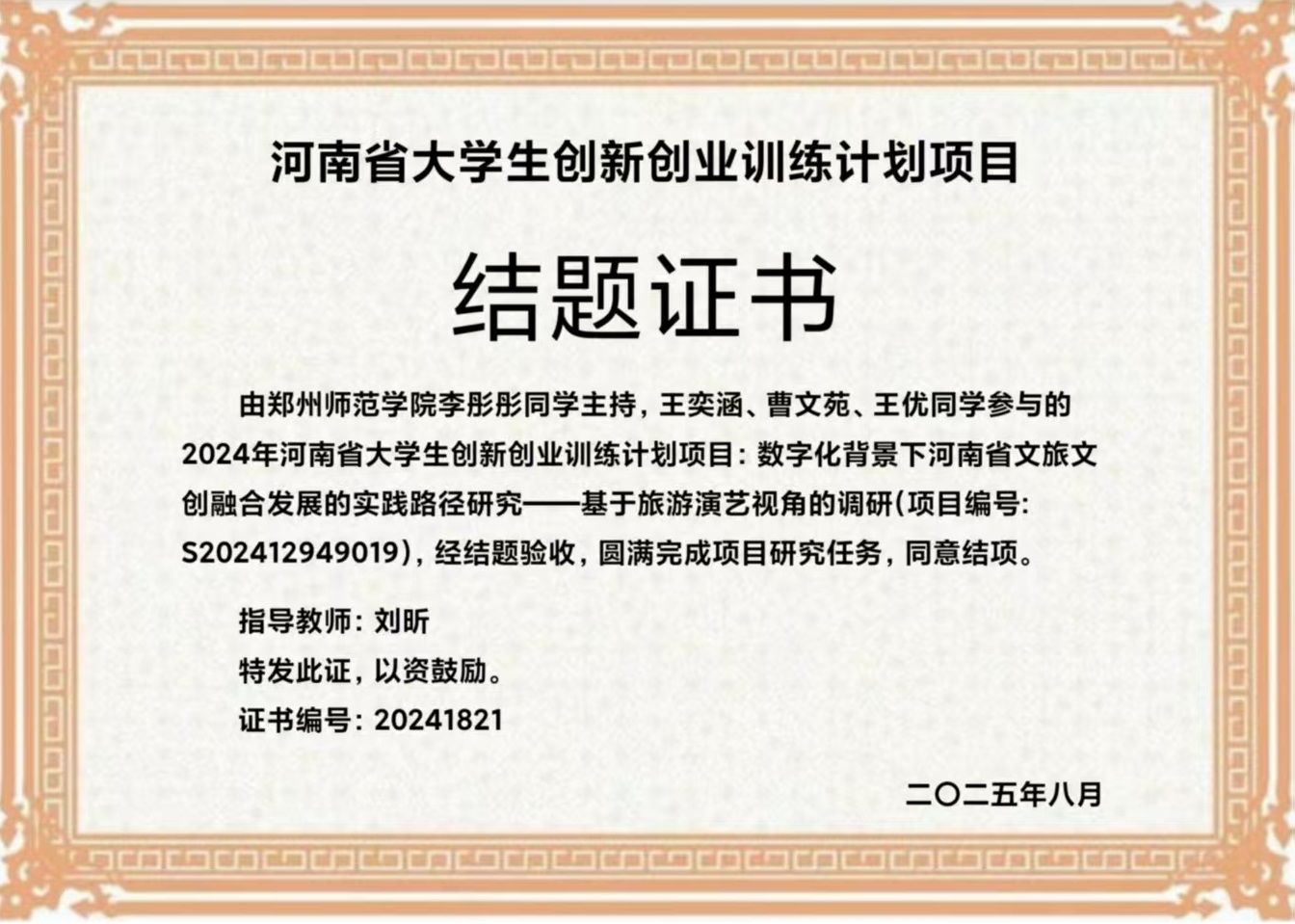 2022级市场营销专业李彤彤同学主持,王奕涵、曹文苑、王优同学参与的2024年河南省大学生创新创业训练计划项目:数字化背景下河南省文旅文创融合发展的实践路径研究--基于旅游演艺视角的调研(项目编号:S202412949019),经结题验收,圆满完成项目研究任务。