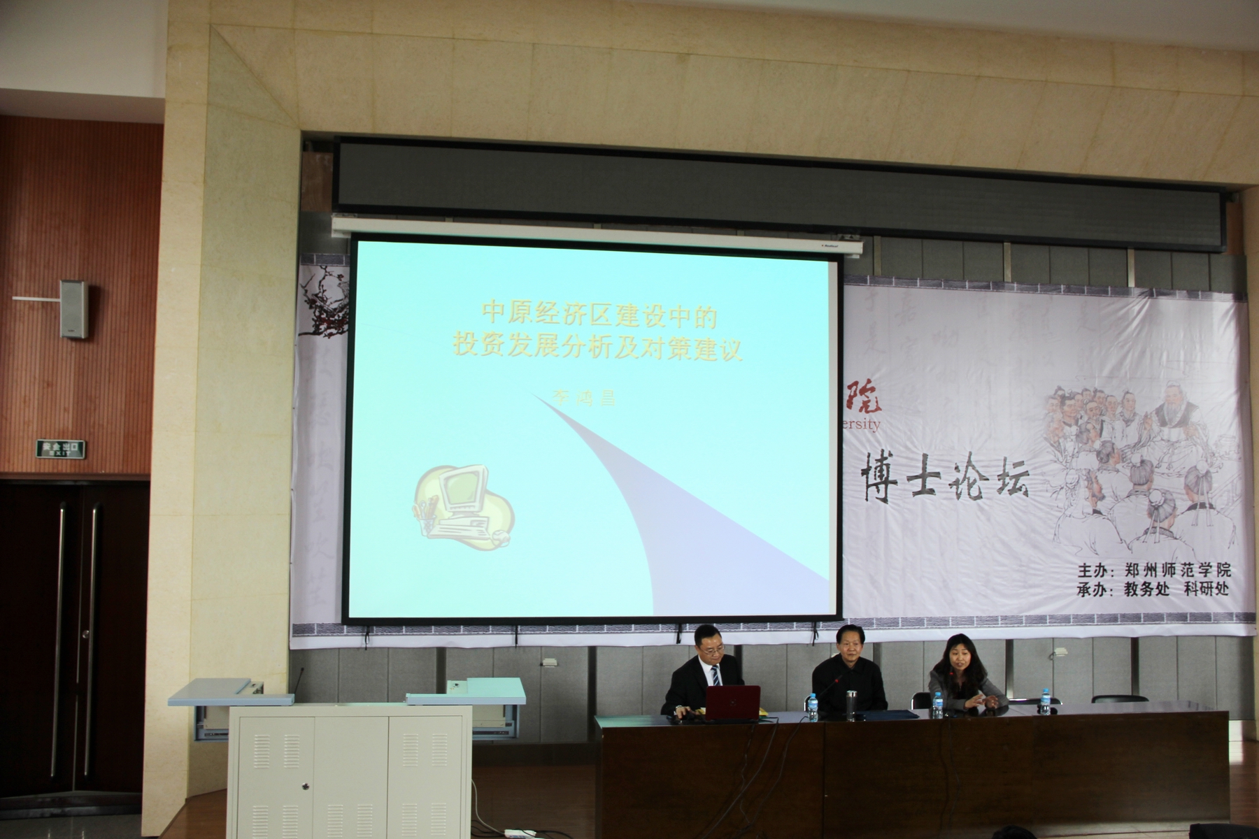 4月17日,“三区四化 郑州的机遇与发展” 高端论坛在我校公共教学楼A301进行。原河南财经政法大学副校长李鸿昌教授、郑州大学商学院院长高友才教授、郑州大学保险系主任李琴英教授、郑州商品期货交易所经理田鑫博士出席论坛。